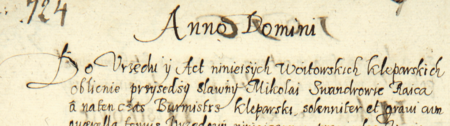 Z kleparskiej księgi wójtowskiej obejmującej lata 1611–1617: początkowy fragment wpisu sprawy z 1616 roku wytoczonej przez Mikołaja Swandrowicza, burmistrza, Janowi Podwalkowicowi o napaść – oraz zbliżenie zapisu imienia i funkcji (Archiwum Narodowe w Krakowie, sygn. KL 10, s. 724–725).