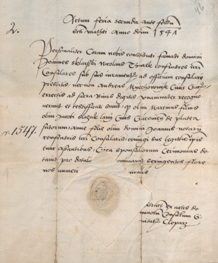 Dokument wystawiony w 1547 roku przez radę miejską Kleparza, w którym potwierdzono, że rajcy kleparscy Jan Szklarski (nr 51) i Mikołaj Turek oraz mieszczanin krakowski Andrzej Miechownik zeznali przed sądem radzieckim, iż nieżyjący już Marcin, syn zmarłego Jakuba Ślęzaka, mieszczanina krakowskiego zamieszkałego przy ul. Szewskiej, zapisał w posagu swojej żonie Annie, córce rajcy kleparskiego Jana notariusza ( Jana z Koszyczek – nr 60), kwotę 600 florenów; dokument opatrzony jest odciskiem kleparskiej pieczęci radzieckiej – oraz zbliżenie pieczęci rady miejskiej i zapisu imienia (Biblioteka Naukowa PAU/PAN w Krakowie, sygn. rkps 437, s. 46)