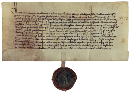 Dokument wydany w 1442 roku w Kleparzu, w którym ławnicy kleparscy, z przyszłym rajcą Mikołajem Zarzecznym w składzie, stwierdzają, że kleryk Stanisław odstąpił swój dom Pawłowi zwanemu Stawinoga i jego żonie Agnieszce; przy dokumencie na paskach pergaminowych pieczęć ławnicza kleparska według najstarszego wzoru – oraz zbliżenie pieczęci i zapisu imienia (Archiwum Uniwersytetu Jagiellońskiego, sygn. dypl. perg. 100)