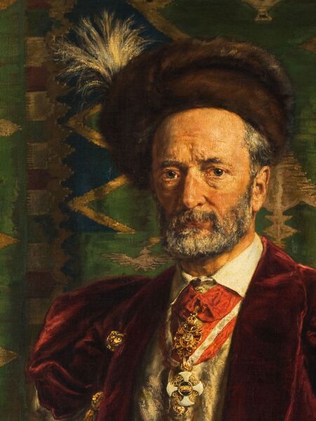 Centralny fragment portretu Mikołaja Zyblikiewicza z 1887 r. pędzla Jana Matejki oraz własnoręczny podpis uhonorowanego.