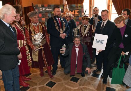 Z uroczystości wręczenia medalu z dyplomem 11 grudnia 2019 r. w Pałacu Wielopolskich. Prezentacja wyróżnienia przez dyrektora Muzeum Krakowa Michała Niezabitowskiego oraz logo laureata.