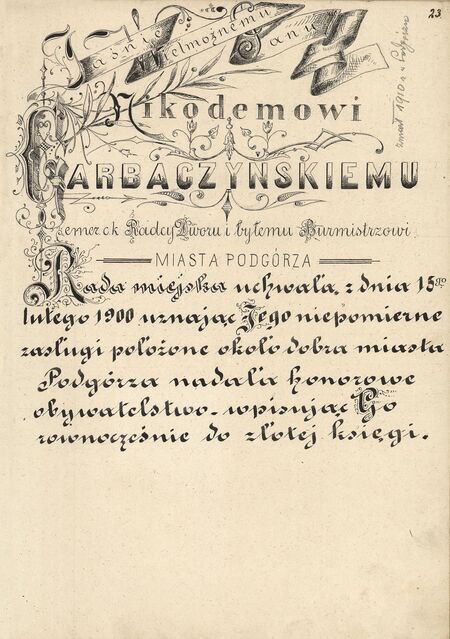 tytuł honorowego obywatela podgórza nadany 15 lutego 1900 roku |
