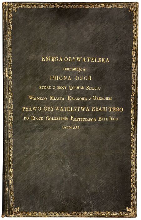 Przód okładziny i pierwsza strona urzędowego spisu Księga obywatelska obejmująca imiona osób, które z mocy uchwał Senatu Wolnego Miasta Krakowa z Okręgiem prawo obywatelstwa kraju tego po epoce ogłoszenia politycznego bytu jego uzyskały; tu zapisywane były trzy kategorie obywatelstw zastrzeżone do wyłącznej właściwości Senatu: (1) obywatelstwa nadawane z urzędu za zasługi, tj. honorowe, (2) obywatelstwa „zwykłe” na wniosek, ale ze zwolnieniem z normalnie obowiązujących rygorów czasu zamieszkiwania w Krakowie i posiadania tu własności, oraz (3) obywatelstwa dla wnioskodawców izraelitów. Wszystkie wpisy obejmują kategorię pierwszą – są tam zapisani pierwsi honorowi obywatele Krakowa: siedmiu uhonorowanych w roku 1818 i dwóch pierwszych z szeregu uhonorowanych w roku 1819. |