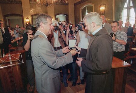 Z uroczystości wręczenia medalu i dyplomu 5 czerwca 2000 r. w Pałacu Wielopolskich. Wystąpienie o. Jerzego Mońki w sali Obrad RMK oraz własnoręczny podpis uhonorowanego.