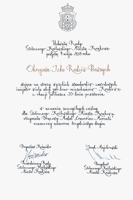 Brązowy medal nr 32 przyznany uchwałą Rady Miasta Krakowa nr CI/2609/18 podjętą 9 maja 2018 r., gdy urząd prezydenta miasta pełnił Jacek Majchrowski, a Radzie przewodniczył Bogusław Kośmider. Uhonorowanie to zbiegło się z jubileuszem 35-lecia działalności Okręgowej Izby Radców Prawnych. Wręczenie medalu wraz z dyplomem nastąpiło 3 października 2018 r. podczas uroczystej sesji Rady Miasta Krakowa w Sali Obrad RMK im. Stanisława Wyspiańskiego w Pałacu Wielopolskich w Krakowie, co uwieczniono w Księdze Medalu „Cracoviae Merenti”.