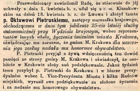 Tytuł nadany uchwałą Rady Miejskiej podjętą na zwyczajnym posiedzeniu 1 kwietnia 1886 r. (DzRMK 1886, L. 14, s. 84), gdy prezydentem miasta był Feliks Szlachtowski. Propozycję zgłosił wiceprezydent miasta Faustyn Jakubowski, łącząc uhonorowanie z jubileuszem 25-lecia pracy Oktawa Pietruskiego na szczeblu krajowym. 18 kwietnia 1886 r. prezydent Feliks Szlachtowski z radcą miejskim Henrykiem Kieszkowskim (także wyróżnionym w tym czasie tytułem honorowego obywatela) przekazali we Lwowie uhonorowanemu dyplom ozdobiony przez artystę malarza Michała Pociechę. Niespełna dwa tygodnie po nadaniu krakowskiego honorowego obywatelstwa Oskar Pietruski otrzymał honorowy tytuł od władz miasta Podgórza (patrz s. 329).