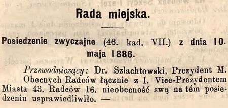 …obchodzącemu … jubileusz 25-cio letniej służby autonomicznej przy Wydziale Krajowym … dla uczczenia jego zasług… (z protokołu posiedzenia Rady Miejskiej – DzRMK 1886, L. 16, s. 99) |
