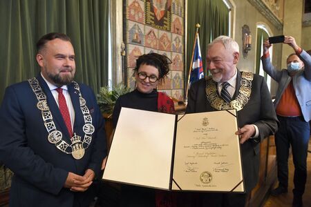 Prezentacja oryginału dyplomu przez Olgę Tokarczuk w towarzystwie przewodniczącego RMK i prezydenta miasta, wystąpienie z mównicy prezydialnej oraz składanie podpisu na duplikacie dyplomu.