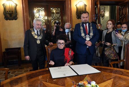 Z uroczystego wręczenia dyplomu honorowego obywatelstwa 8 października 2021 r. Olga Tokarczuk podczas uroczystości w Sali Obrad RMK oraz własnoręczny podpis uhonorowanej.