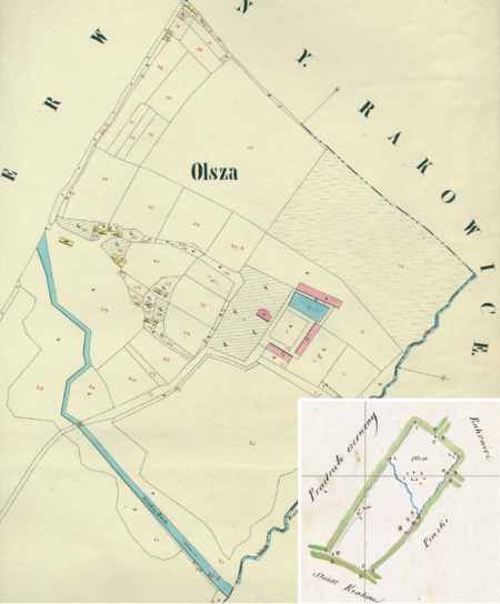 Orientacyjna lokalizacja dawnej wsi Olsza w obecnych granicach Krakowa – na planie miasta oznaczono jej położenie w kształcie wyznaczonym granicami jednostki katastralnej, jaką stanowiła, ze wskazaniem najstarszego, historycznego centrum Olszy w rejonie dzisiejszej ulicy Dukatów