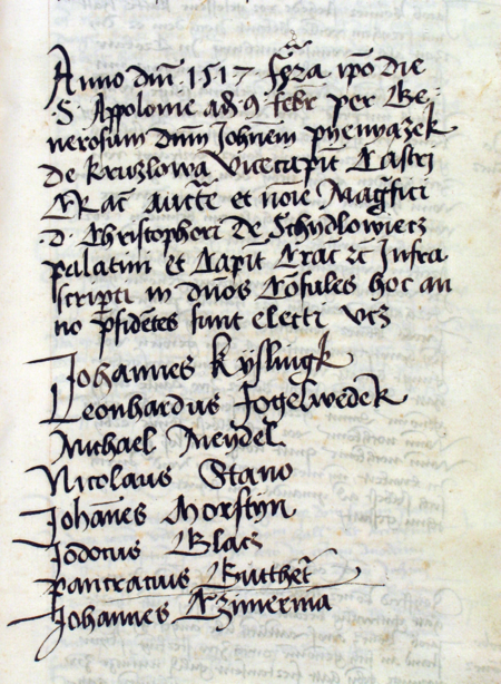 Z księgi radzieckiej obejmującej lata 1512–1526 fragment wpisu ze strony 311 z wykazem rajców urzędujących wybranych na rok 1517 z Pankracym Gutteterem w składzie – oraz powiększenie zapisu imienia (Archiwum Państwowe w Krakowie, sygn. rkps 432, s. 311)