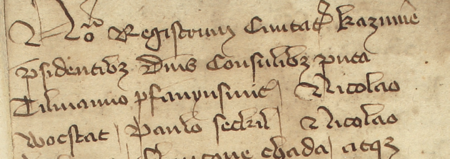 Z księgi radzieckiej Kazimierza obejmującej lata 1385–1386: fragment wpisu dokumentującego wybór rajców na rok 1385, z Pawłem Zeckilem w składzie – oraz zbliżenie zapisu imienia (Archiwum Narodowe w Krakowie, sygn. K 2, s. 1)