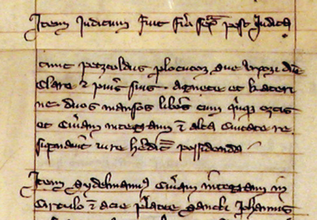 Z najstarszej zachowanej księgi miejskiej krakowskiej obejmującej lata 1300–1375: wpis z 1321 roku stwierdzający, że Peczold pełnomocnik zrzekł się na rzecz swojej żony Klary oraz córek Agnieszki i Katarzyny dwóch wolnych łanów, pięciu ogrodów oraz dworu położonych w Wysokim Mieście (Alta Civitate) – oraz zbliżenie zapisu imienia i zajęcia (Archiwum Narodowe w Krakowie, sygn. rkps 1, s. 58–59)