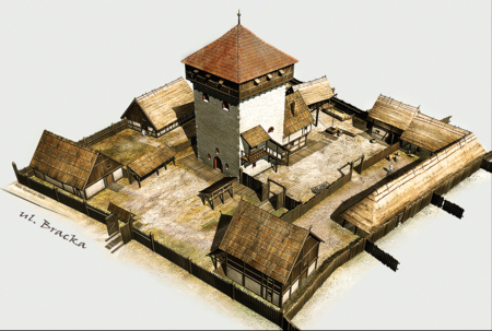 (049) Rekonstrukcja średniowiecznej wieży wójtowskiej usytuowanej na parceli u zbiegu ulic Brackiej i Gołębiej: dolna część wieży przedstawiona na podstawie zachowanych pozostałości (zob. il. 050–051), górna część to założenie hipotetyczne – opracowanie graficzne Piotr Opaliński, według wskazówek Waldemara Komorowskiego (udostępnione dzięki uprzejmości autorów)