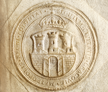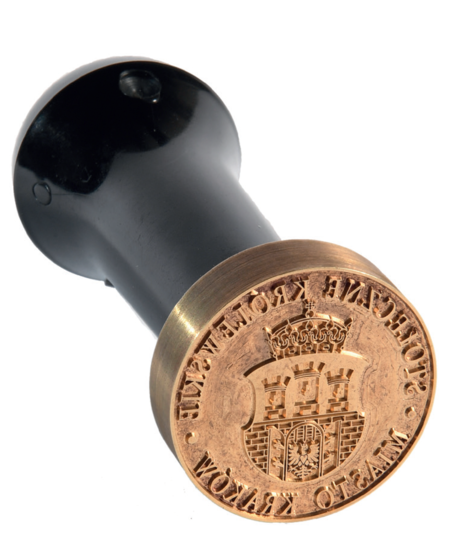 (075–076) Rada Miasta Krakowa w swojej uchwale z 2002 r. w sprawie symboli Krakowa postanowiła, że [p]ieczęć Stołecznego Królewskiego Miasta Krakowa ma kształt okrągły, w polu pieczęci znajduje się herb, w otoku napis: STOŁECZNE KRÓLEWSKIE MIASTO KRAKÓW. Załączony do uchwały wzorzec określił jej wielkość (średnica 35 mm) oraz postać graficzną. Tak też przedstawiają się wykonane na tej podstawie dwa identyczne tłoki pieczętne: jeden pozostający w gestii prezydenta miasta, drugi w gestii przewodniczącego Rady Miasta Krakowa. W myśl prezydenckiego zarządzenia z 2004 r. (powtórzonego w roku 2017) w sprawie zasad posługiwania się symbolami [p]ieczęć Stołecznego Królewskiego Miasta Krakowa służy do opatrywania szczególnie ważnych lub uroczystych dokumentów (z zasobów UMK)