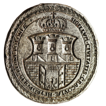 (068–069) Stalowy stempel oraz jego lustrzane odbicie pieczęci ufundowanej przez rajcę Krzysztofa Krauza według wzoru ustalonego przez rajców w 1661 r. (zob. il. 067). Historyczne znaczenie miało tu wprowadzenie do bramy muru na tarczy herbowej ukoronowanego orła. Stempel ma kształt owalny, wymiary 56 x 49 mm, w otoku widnieje napis: SIGILLVM CIVITATIS CRACOVIAE METROPOLIS REGNI POLONIAE (pieczęć miasta Krakowa stolicy Królestwa Polskiego). Obok tej pieczęci przygotowano też i wprowadzono do użytku pieczęć mniejszą, o wymiarach 45 x 40 mm (ANK, sygn. T 276)