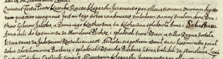 Z księgi radzieckiej kazimierskiej obejmującej sprawy z lat 1600–1603: początkowy fragment wpisu z 1602 roku zawierającego oświadczenie rajcy Piotra Kaszuby w sprawie rodowodu i powiązań rodzinnych Gilasów z Kleparza – oraz zbliżenie zapisu imienia i urzędu (Archiwum Narodowe w Krakowie, sygn. K 127, s. 407)