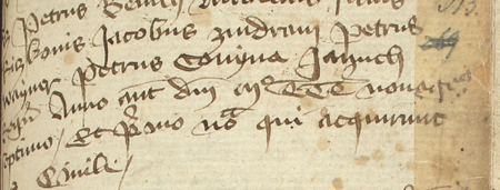 Z księgi radzieckiej Kazimierza obejmującej lata 1391–1402: fragment wpisu dokumentującego wybór rajców na rok 1397, z Piotrem Koniną w składzie – oraz zbliżenie zapisu imienia (Archiwum Narodowe w Krakowie, sygn. K 4, s. 313)