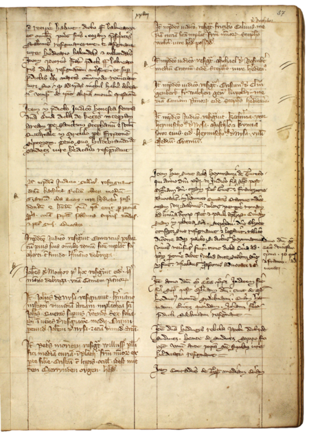 Z „Najstarszej księgi” strona 57 z zapisem z 1320 roku potwierdzającym, że Piotr Moritz odstąpił Wilusowi kuśnierzowi połowę dworzyszcza położonego przy ul. Braci Mniejszych (obecnie Bracka) – oraz powiększenie zapisu imienia (Archiwum Państwowe w Krakowie, sygn. rkps 1, s. 57)