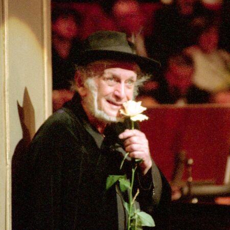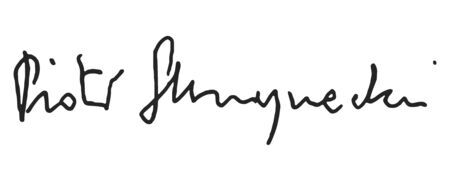 Piotr Skrzynecki podczas wieńczącego święto Piwnicy pod Baranami koncertu w Teatrze im. Juliusza Słowackiego 7 maja 1994 r. oraz własnoręczny podpis uhonorowanego.
