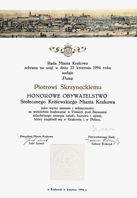 Tytuł nadany uchwałą Rady Miasta Krakowa nr CXI/729/94 podjętą 22 kwietnia 1994 r., gdy urząd prezydenta miasta pełnił Józef Lassota, a Radzie przewodniczył Tadeusz Kołaczyk. Wręczenie dyplomu nastąpiło 7 maja 1994 r. w Teatrze im. Juliusza Słowackiego podczas koncertu z okazji święta Piwnicy pod Baranami. Duplikat dyplomu zdeponowany został w Muzeum Krakowa.