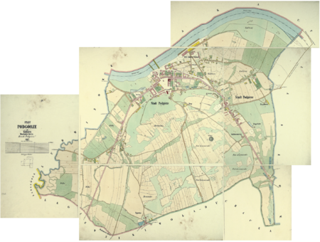 Mapa katastralna Podgórza według stanu na rok 1849 – miasto w pełnych granicach oraz zbliżenie planu centrum