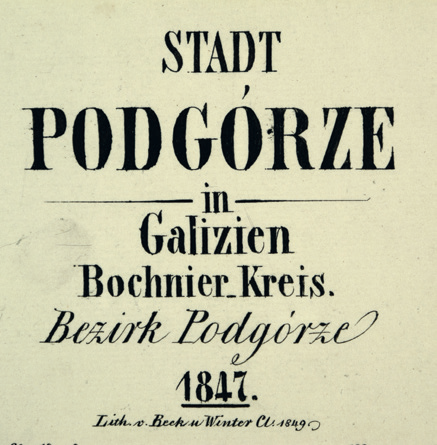 Mapa katastralna Podgórza według stanu na rok 1849 – miasto w pełnych granicach oraz zbliżenie planu centrum (Archiwum Narodowe w Krakowie, sygn. K. Krak. 441)