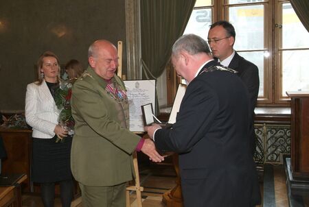 Z uroczystości wręczenia medalu z dyplomem 30 października 2007 r. w Pałacu Wielopolskich. Prezes Zarządu Towarzystwa Konrad Firlej z wiceprezesem Andrzejem Łopatą i skarbnikiem Stanisławem Doboszem w trakcie aktu wpisu do Księgi Medalu „Cracoviae Merenti” oraz logo laureata.