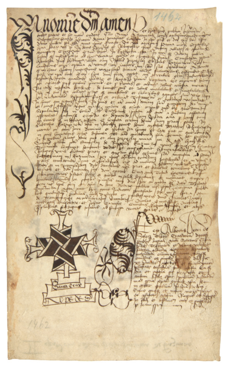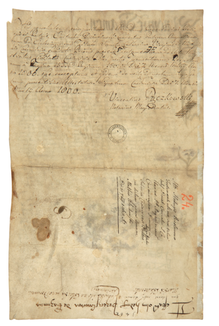 Strony recto i verso dokumentu wystawionego w 1462 roku w Kazimierzu, w którym Piotr z Solca, kleryk diecezji krakowskiej, notariusz publiczny, zaświadcza, że Jadwiga, wdowa po rajcy Przecławie, zapisała w testamencie swój dom leżący na Blechu klasztorowi oo. Augustianów przy kościele św. Katarzyny w Kazimierzu; widoczny znak notarialny, na odwrocie natomiast streszczenia (z XV wieku, uzupełnione w wiekach XVII i XVIII) – oraz zbliżenie zapisu imienia i urzędu (Archiwum Narodowe w Krakowie, sygn. Aug. perg. 183)