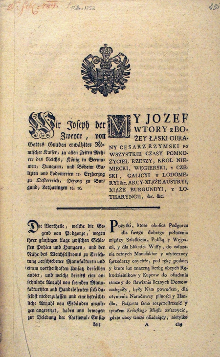 My Jozef Wtory z Bożej łaski obrany cesarz rzymski po wsze czasy pomnożyciel Rzeszy, król niemiecki, wękierski y czeski, Galicji y Lodomeryi etc. arcy-xiąże Austryi, xiąże Burgundyi y Lortharyngii, etc. Pożytki, które okolica Podgórza dla swego dobrego położenia między Szląskiem, Polską y Węgrami, y dla bliskości Wisły, do założenia różnych manufaktur y użyteczney sprzedaży onychże, pod rękę podaje, y które już znaczną liczbę obcych rękodzielników y kupców do osiadania tamże y do stawiania licznych domów zachęciły, były Nam powodem dla ozywienia narodowej pilności y handlu, Podgórze samo rozprzestrzenić y tytułem Królewskiego Miasta zaszczycić, gdzie obcy tamże osiadający, nie tylko chętnie przyjęci, ale też onymże protekcya, dzielna pomoc, wolność y swobody nadane będą. § 1. Podgórze więc wraz z osiadłością tamże naydującą się y obszernością mieysca do rozszerzenia onegogoż między nim y Ludwinowem wyznaczonego, zachowując go przy teraźniejszym nazwisku, Miastem Wolnym Królewskim ogłaszamy, które pod dozorem y zarządzaniem Naszych Rządów Krajowych, wolnościami y prawami wszystkich innych królewskich wolnych miast zaszczycać się ma y jak tylko tamże przyzwoity magistrat ustanowiony będzie, tak jako Nasze Królewskie Stołeczne Miasto Lwów prawo mieć ma, do obrad stanów z pomiędzy siebie deputatów głos y mieyscew zabierających tak jako y inne stany krajowe, wysyłać (z powyższego dokumentu początkowy fragment, s. 235–236).