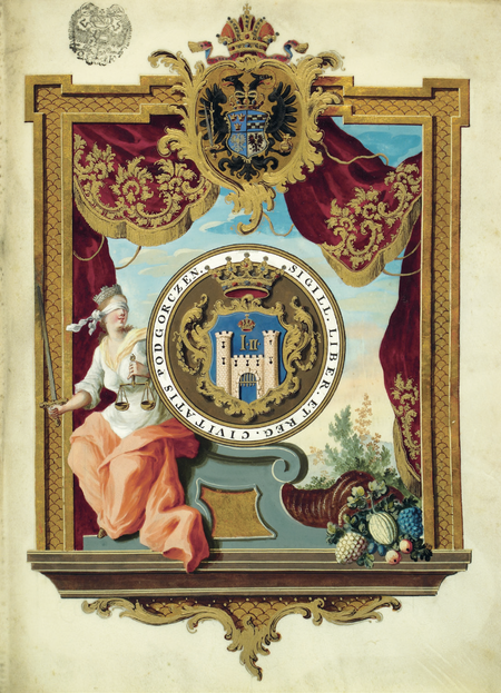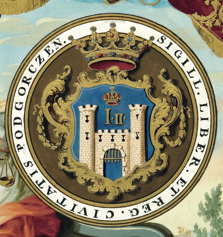 Strony z dokumentu wydanego w 1785 roku w Wiedniu, mocą którego cesarz Józef II potwierdził wcześniejsze wyniesienie osady Podgórze do rzędu królewskich miast z wolnohandlowymi prawami i przyznające jego mieszkańcom wolności i prawa wymienione w dziewięciu punktach. Jednocześnie cesarz nadał miastu herb z wizerunkiem swoich ukoronowanych inicjałów nad warowną bramą z wieżami i z napisem w otoku: SIGILL[UM] LIBER[AE] ET REG[IAE] CIVITATIS PODGORCZEN[SIS] – PIECZĘĆ WOLNEGO I KRÓLEWSKIEGO MIASTA PODGÓRZA – oraz zbliżenie wizerunku herbu (Archiwum Narodowe w Krakowie, sygn. perg. 1106)