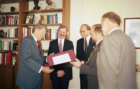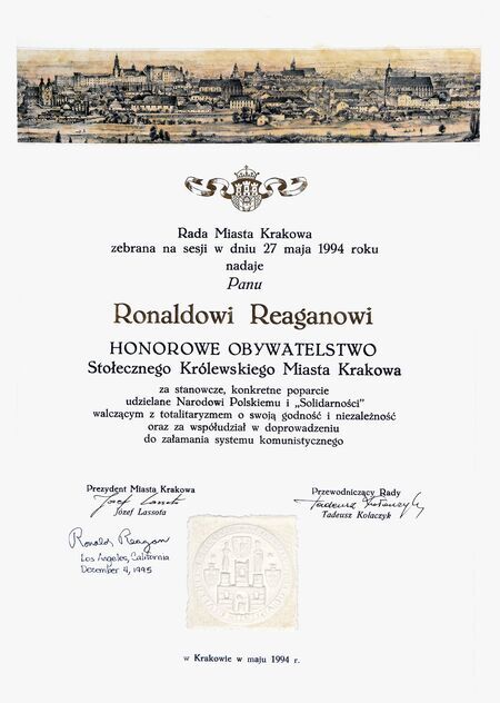 W gabinecie wręczenie dyplomu honorowego obywatelstwa przez prezydenta miasta i przewodniczącego RMK, obok prezydenta USA Tomasz Trafas, pracownik Konsulatu Generalnego RP w Los Angeles, brat Kazimierza Trafasa, byłego przewodniczącego Komisji Spraw Zagranicznych Rady Miasta Krakowa I kadencji; niżej duplikat dyplomu oraz złożenie przez Ronalda Reagana podpisu na tym duplikacie.