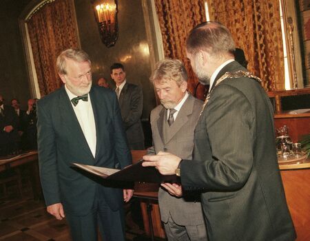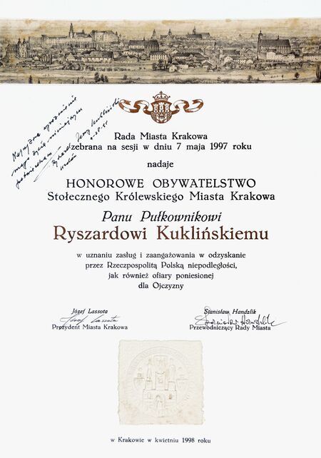 Z uroczystości wręczenia dyplomu honorowego obywatelstwa 28 kwietnia 1998 r. w Pałacu Wielopolskich. Ryszard Kukliński w sali Obrad RMK oraz własnoręczny podpis uhonorowanego.