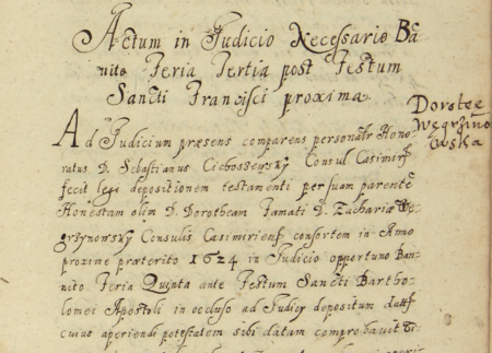 Z księgi testamentów kazimierskich obejmującej lata 1622–1647: początkowy fragment wpisu dotyczącego otwarcia w 1625 roku testamentu zmarłej Doroty Węgrzynowskiej, żony rajcy Zachariasza Wegrzynowskiego (nr 281), oświadczonego w 1624 roku; otwarcia tego dokonywał burmistrz Sebastian Cichoszowski, syn Doroty z jej pierwszego małżeństwa – oraz zbliżenie zapisu imienia i urzędu (Archiwum Narodowe w Krakowie, sygn. K 443, s. 65)