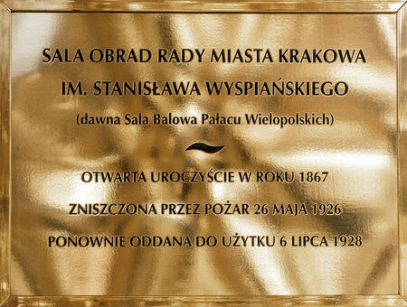 Aktualny widok sali obrad Rady Miejskiej w Pałacu Wielkopolskich, której Rada uchwałą podjętą 7 listopada 2007 r. nadała imię Stanisława WYSPIAŃSKIEGO (nr 2509), radcy miejskiego zasiadającego w tej sali od roku 1905 do śmierci w roku 1907, w trakcie trwania jego kadencji w Radzie.