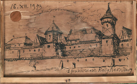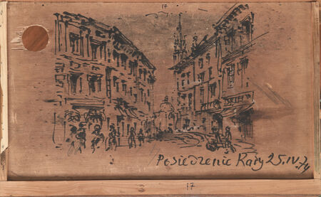 Na akwareli z 1871 roku nieznanego autora widok dawnego kolegium jezuickiego przy ul. Grodzkiej 52, w latach 1815/1816–1846 siedziby władz Wolnego Miasta Krakowa. W drugiej połowie XIX wieku dobudowano skrzydło od ul. Grodzkiej, nadając kompleksowi budynków znany obecnie kształt. Z prawej strony widoczna północna elewacja bazyliki św.św. Apostołów Piotra i Pawła.