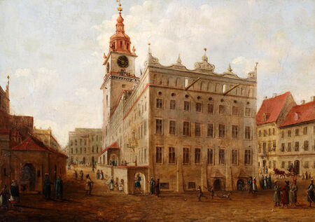 widok ratusza z wieżą ratuszową w ujęciu od strony ul. św. Anny, po prawej stronie obraz Teodora Baltazara