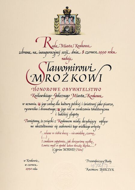 Tytuł nadany uchwałą Rady Miasta Krakowa nr I/6/90 podjętą 8 czerwca 1990 r. na posiedzeniu inauguracyjnym nowo wybranej, odrodzonej Rady. W tym też dniu funkcję przewodniczącego tego organu objął Kazimierz Barczyk. 20 czerwca tegoż roku Rada Miasta wybrała na prezydenta miasta Jacka Woźniakowskiego. Na tym samym posiedzeniu nastąpiło wręczenie dyplomu honorowego obywatelstwa Sławomirowi Mrożkowi. Wyróżnienie miało miejsce w jubileusz 60-lecia urodzin uhonorowanego oraz 40-lecia debiutu jako rysownika. Duplikat dyplomu zdeponowany został w Muzeum Krakowa (patrz także s. 130).