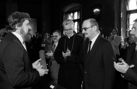 Duplikat dyplomu honorowego obywatelstwa; wręczenie oryginału dyplomu przez przewodniczącego RMK (przy laureacie metropolita krakowski kard. Franciszek Macharski); po lewej stronie uhonorowany podczas wystąpienia.