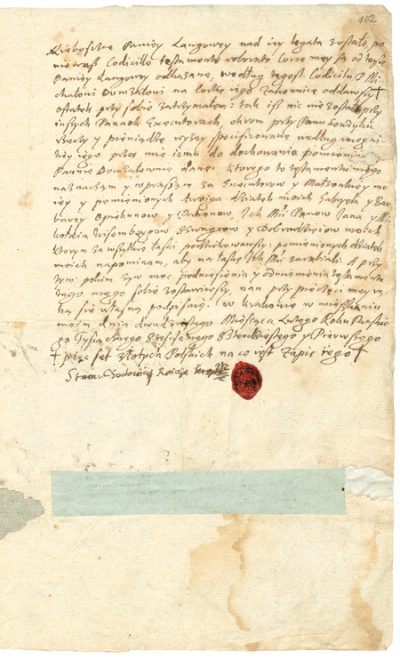 Pierwsza i ostatnia strona testamentu Stanisława Chodowicza, który podyktował 20 lutego 1641 roku, na krótko przed śmiercią, „dwa pozwy na to mając, to jest starość i chorobę”; na powiększeniu jego własnoręczny podpis z podaniem rajcowskiego tytułu oraz z odciśniętym gmerkiem (Biblioteka Jagiellońska, sygn. rkps 884, s. 101–102)