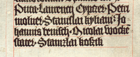 Z księgi radzieckiej Kazimierza obejmującej lata 1402–1416: fragment wpisu dokumentującego wybór rajców na rok 1410, ze Stanisławem Koszikiem w składzie – oraz zbliżenie zapisu imienia (Biblioteka Jagiellońska, sygn. rkps 1045/1, k. 197)