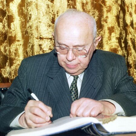 Z uroczystości wręczenia dyplomu honorowego obywatelstwa 22 marca 1997 r. w Pałacu Wielopolskich. Stanisław Lem w sali Obrad RMK oraz własnoręczny podpis uhonorowanego.