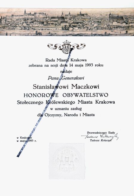 Tytuł nadany uchwałą Rady Miasta Krakowa nr LXXXII/ 534/93 podjętą 14 maja 1993 r., gdy urząd prezydenta miasta pełnił Józef Lassota, a Radzie przewodniczył Tadeusz Kołaczyk. Wyróżnienie zbiegło się ze 101. rocznicą urodzin Stanisława Maczka. Dyplom honorowego obywatelstwa w imieniu Rady Miasta Krakowa przekazał na przełomie maja i czerwca 1993 r. w szkockim Edynburgu do rąk wyróżnionego radny Kazimierz Trafas, przewodniczący Komisji ds. Współpracy z Zagranicą i Współpracy z Gminami RMK. W Muzeum Krakowa zdeponowano egzemplarz dyplomu odbiegający od ostatecznego jego kształtu, o czym w podpisie do ilustracji (patrz także s. 154).