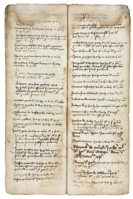 Z księgi przyjęć do prawa miejskiego obejmującej lata 1423–1493 strony 102–103 z wpisem z 1442 roku, stwierdzającym przyjęcie do prawa miejskiego Grzegorza Fiola, za którego poręczyli Stanisław Podzancze i Jarosz – oraz powiększenie zapisu imienia (Archiwum Państwowe w Krakowie, sygn. rkps 1421, s. 102–103)