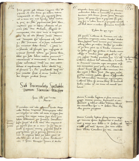 Z księgi radzieckiej obejmującej lata 1540–1542 strony 132–133 z początkiem wpisów spraw za kadencji burmistrzowskiej Stanisława Wacława w 1540 roku – oraz powiększenie zapisu imienia i funkcji burmistrza (Archiwum Państwowe w Krakowie, sygn. rkps 438, s. 131–132)