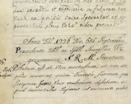 Z urzędowego spisu rajców obejmującego lata 1363–1802 fragment strony 68 z wpisem o wyborze do rady na miejsce po zmarłym Tomaszu Marcinkowskim (nr 582) nowego rajcy Franciszka Soldadiniego (nr 602), czego dokonano za kadencji burmistrzowskiej Stanisława Węgrzynowicza w 1726 roku – oraz powiększenie zapisu imienia i funkcji burmistrza (Archiwum Państwowe w Krakowie, sygn. rkps 1477, s. 68)