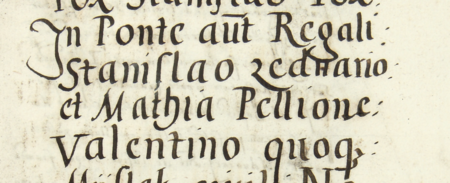 Z księgi radzieckiej Kazimierza obejmującej lata 1545-1551: fragment wpisu dokumentującego wybór rady urzędującej na 1546 rok, ze Stanisławem Zednarskim w składzie – oraz zbliżenie zapisu imienia (Archiwum Narodowe w Krakowie, sygn. K 11, s. 33)