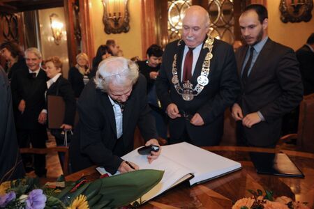 Z uroczystości wręczenia medalu z dyplomem 16 października 2013 r. w Pałacu Wielopolskich. Stefan Dousa w Sali Obrad RMK oraz własnoręczny podpis uhonorowanego.
