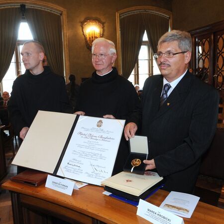Z uroczystości wręczenia medalu z dyplomem 27 maja 2009 r. w Pałacu Wielopolskich. Prezentacja medalu i dyplomu w Sali Obrad RMK (medal w rękach dyrektora Szpitala dr. Marka Krobickiego, dyplom prezentuje goszczący specjalnie brat Donatus Forkan, przełożony generalny zakonu bonifratrów) oraz logo Szpitala.