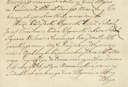 Z księgi wójtowsko-ławniczej Kleparza obejmującej lata 1769–1794: fragment wpisu z 1793 roku dokumentującego sprawę wprowadzenia obywatela kleparskiego Stanisława Gasińskiego w posiadanie domu („w dom wiązanie”), prowadzoną pod przewodnictwem Szymona Bielewicza, wówczas burmistrza i wójta Kleparza – oraz zbliżenie zapisu imienia i funkcji (Archiwum Narodowe w Krakowie, sygn. KL 21, s. 327)